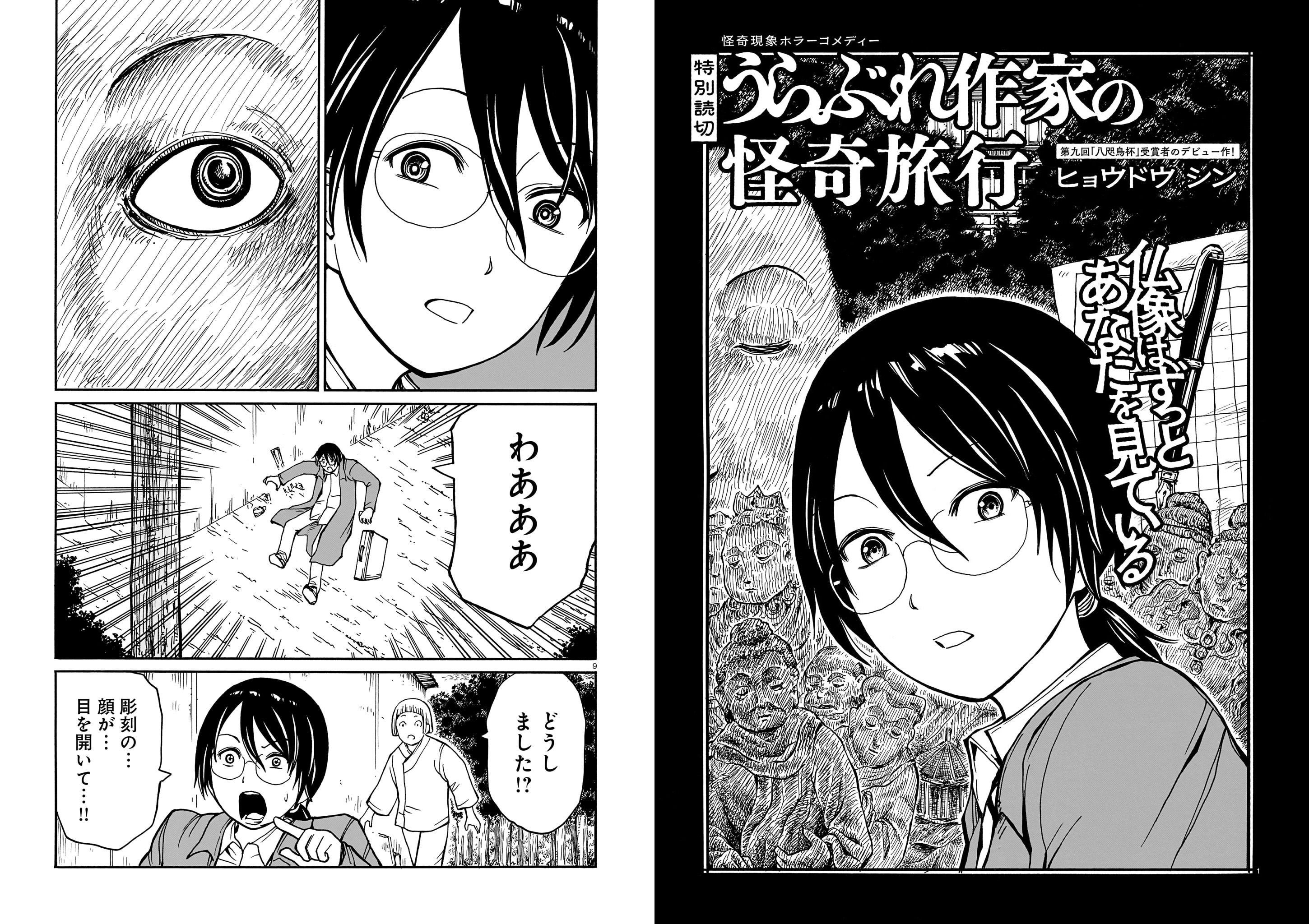 ◆「うらぶれ作家の怪奇旅行」ヒョウドウ シン-山で迷った男が、森の奥で見つけた一軒の家。そこは彫刻家の住処で、周囲の木には人面の彫刻が刻まれていた。どれも精巧な作品だと感心する男。だがふと気づく。その木像が、まばたきをしたことに――。第九回「八咫烏杯」受賞者が描く、怪奇ホラー。(受賞作はコチラから!)